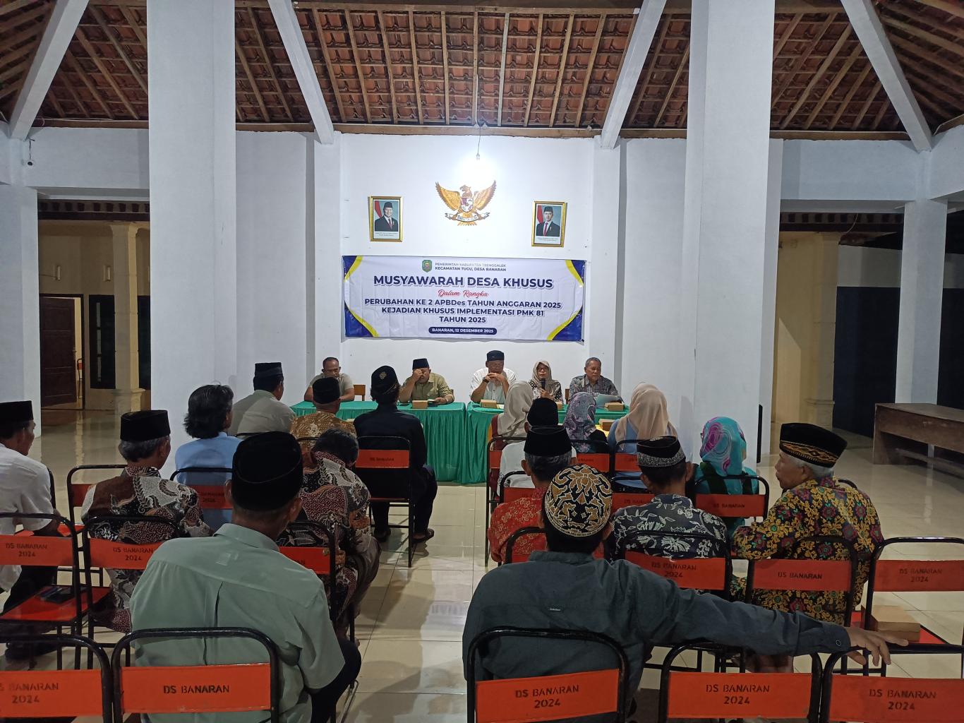 Musyawarah dimulai pada pukul 19.00 WIB dengan dipimpin oleh Ketua BPD. Hasil akhir musyawarah menyepakati beberapa keputusan diantaranya pengurangan pagu dana desa sebesar Rp. 231.001.740,00 dikarenakan implementasi PMK 81 Tahun 2025.